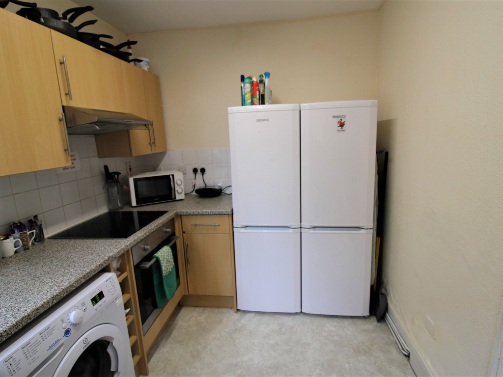 The kitchen includes ample cupboard space & work top area, a washing machine, fridge, fridge/freezer and microwave.